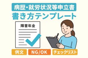 障害年金の「病歴・就労状況等申立書」を書くためのテンプレート。例文・NG/OK表現・チェックリスト付きで、初めてでも迷わず作成できます。