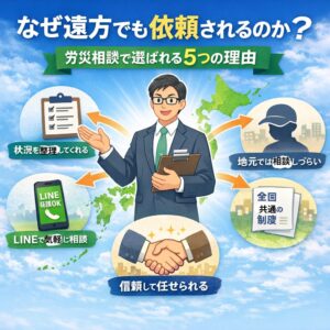 「労災の相談は、近くの社労士でないと難しいのでは」 「地方の事務所に相談しても大丈夫なのか」 そのように感じている方は少なくありません。